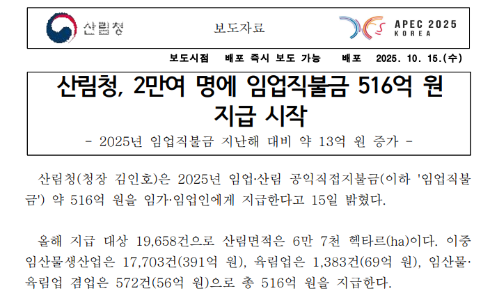 산림청은 2025년 10월 15일, 임업직불금 총 516억 원을 19,658건의 신청 건에 대해 지급한다고 발표했습니다. 이는 전년도보다 약 13억 원이 증가한 수치로, 정부가 임업 분야의 공익적 가치를 높게 평가하고 있다는 방증입니다.