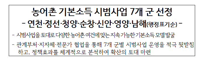 ‘농어촌 기본소득 시범사업’의 본격적인 출발을 알리며, **전국 7개 군(연천·정선·청양·순창·신안·영양·남해)**이 최종 선정되었습니다